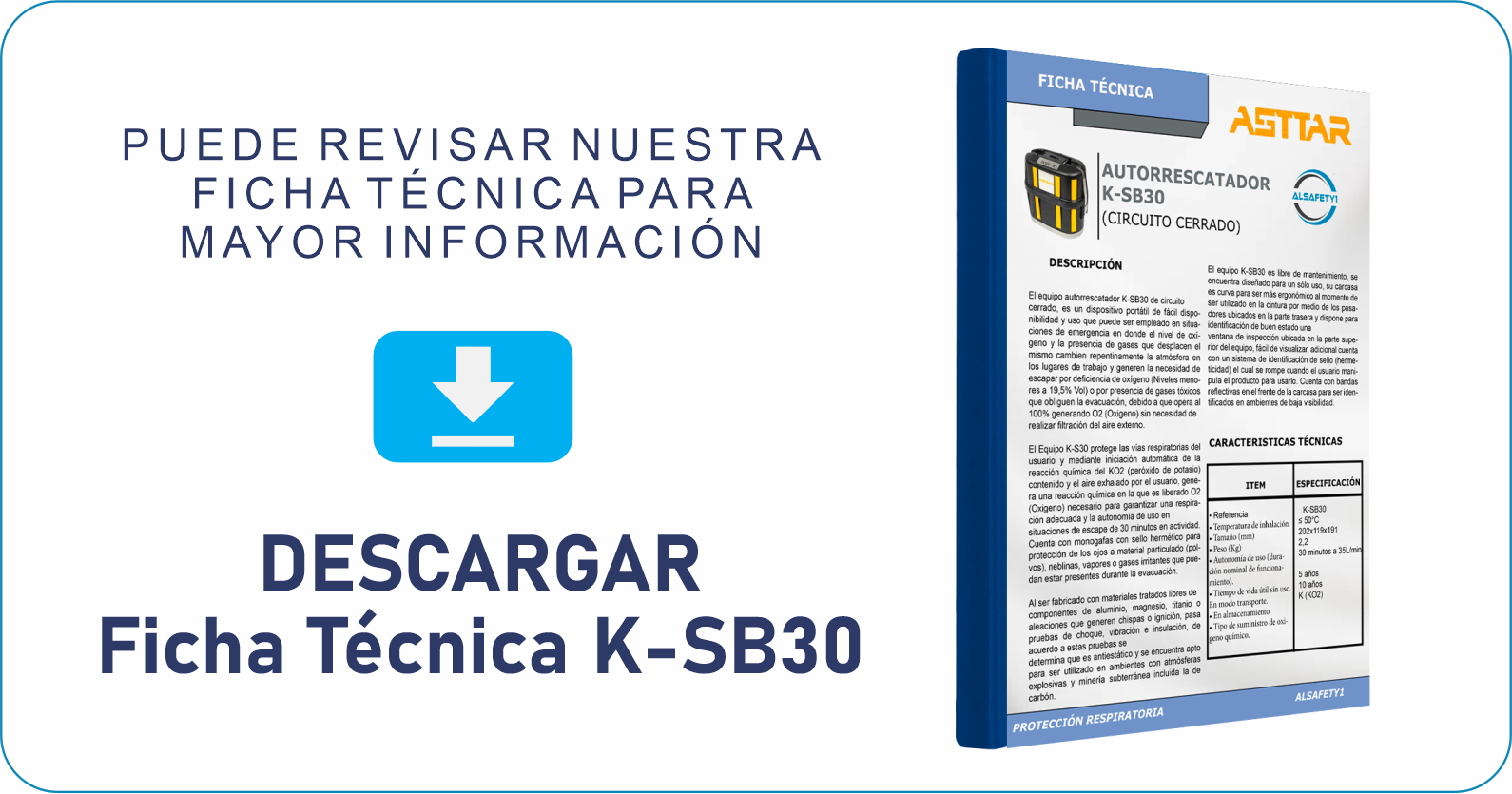 El equipo autorrescatador K-SB 30 de circuito cerrado, es un dispositivo portátil de fácil disponibilidad y uso que puede ser empleado en situaciones de emergencia en donde el nivel de oxígeno y la presencia de gases que desplacen el mismo cambien repentinamente la atmósfera en los lugares de trabajo y generen la necesidad de escapar por de ficiencia de oxígeno (Niveles menores a 19,5 % Vol) o por presencia de gases tóxicos que obliguen la evacuación, debido a que opera al 100% generando O2 (Oxigeno) sin necesidad de realizar filtración del aire externo.
